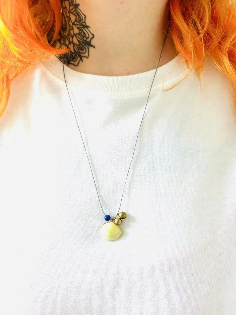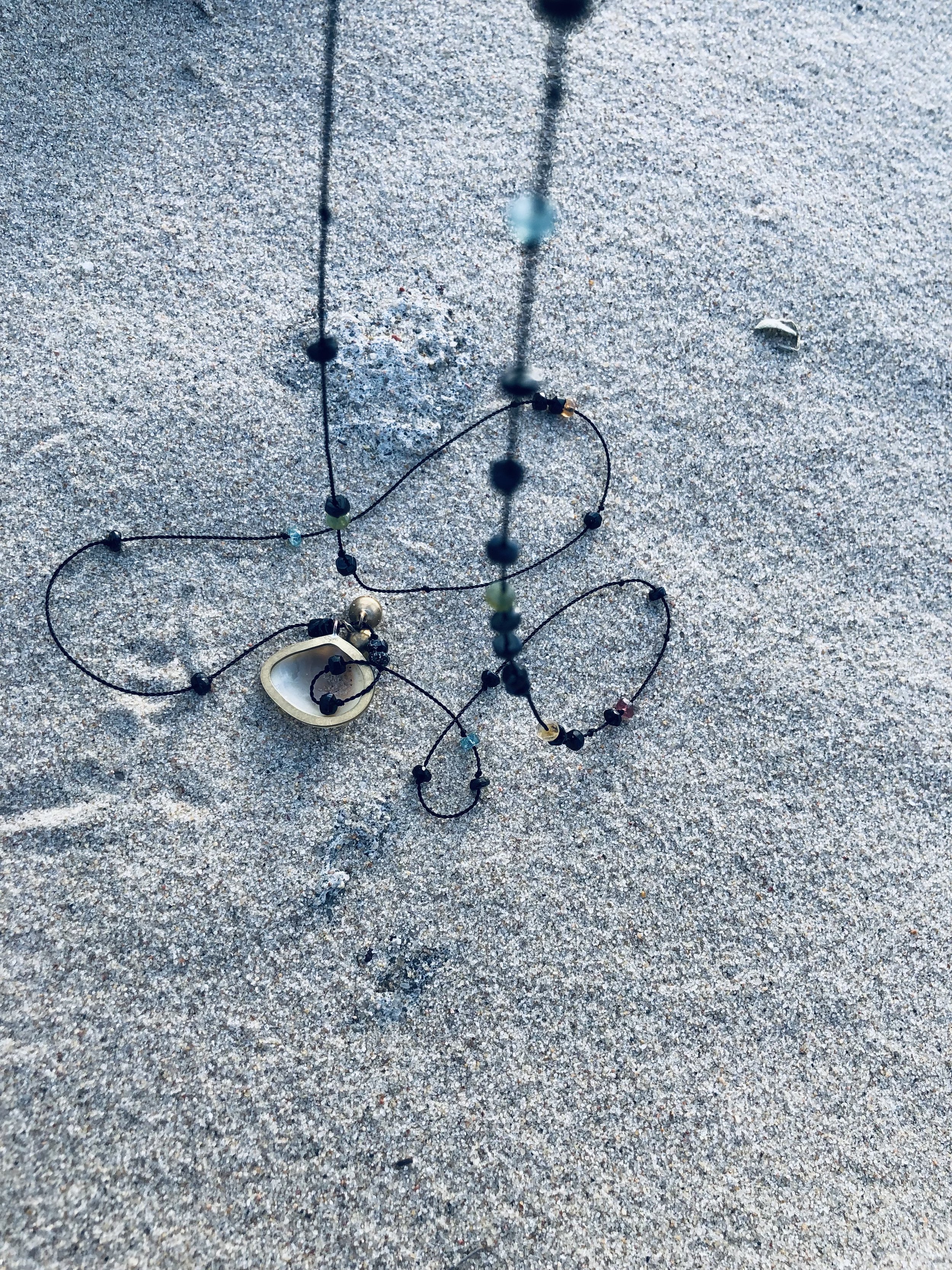 Materialien: Baltische Plattmuschel mit Messingrahmen, Turmaline, schwarze Nylonschnur, Bronzeglöckchen, HALLO FROM EARTH Plättchen