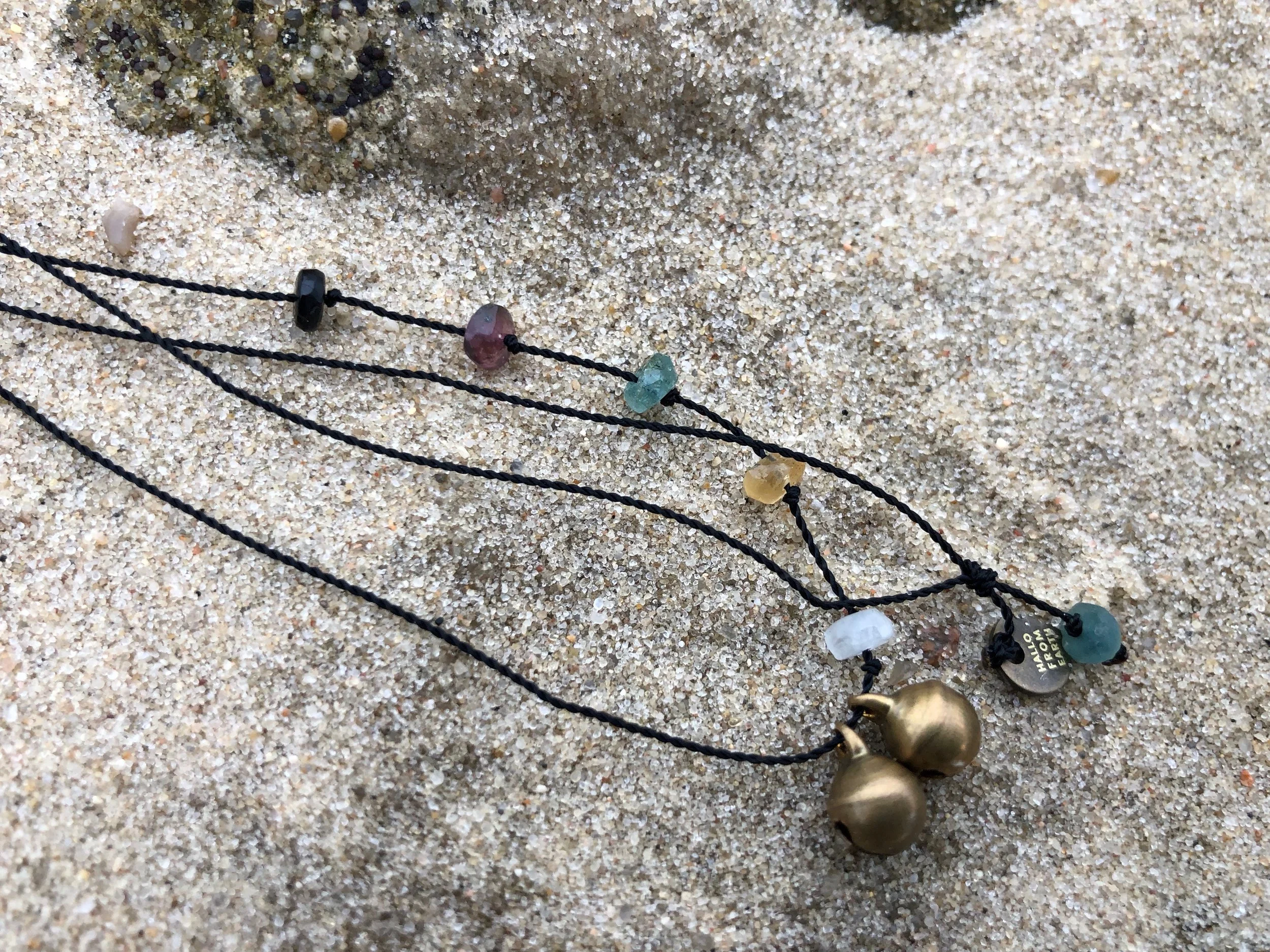 Materialien: mehrfarbige Beryll-Edelsteine, braune Nylonschnur, Bronzeglöckchen, HALLO FROM EARTH Charm