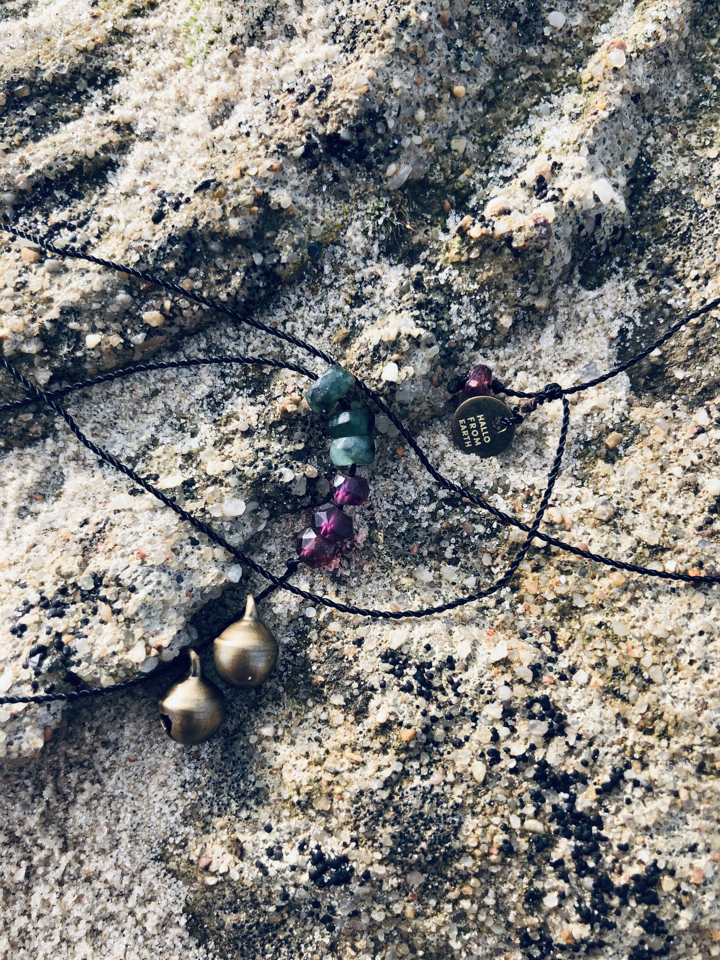 Materialien: Smaragd, Granat, schwarze Nylonschnur, Bronzeglöckchen, HALLO FROM EARTH Plättchen